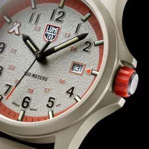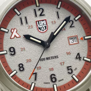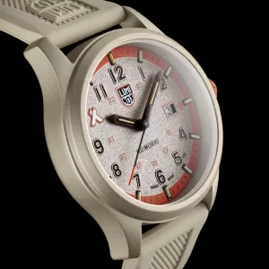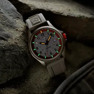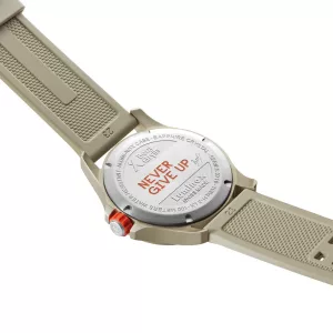 Crafted for long expeditions and inspired by survival legend Bear Grylls, the XB.3716 watch is your ultimate field companion. The sleek 43mm case is made of ultra-lightweight ALUMI-NOX, an aerospace-grade aluminum which offers exceptional strength, anti-corrosion protection, and anti-magnetic precision. The sand-blasted texture of the sand colored dial boosts readability while a date window offers added functionality. Swiss Made and water-resistant to 100 meters, the watch features a scratch-resistant sapphire crystal, Swiss Quartz movement and the signature Bear Grylls design elements including the orange crown, his iconic logo at 10 o’clock and his Never Give Up mantra engraved on the case back. The Luminox Light Technology with 14 light tubes ensures constant visibility day or night making this a perfect watch for those who love to explore the outdoors.