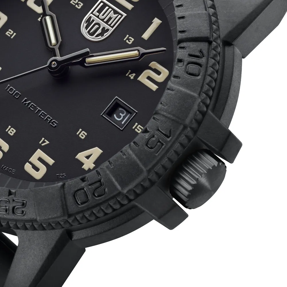 This watch is inspired by one of the ocean’s toughest sea creatures that travels thousands of miles across the Atlantic and Pacific Ocean, the Leatherback SeaTurtle . Just like its namesake this timepiece is tough and durable featuring a 44mm CARBONOX™ case and uni-directional bezel. The sand tone markers and hands create a stunning contrast to the black dial, watch case and bezel. The classic case design with the protected crown balanced by an opposite outcropping has created the iconic “turtle shape”. The watch is powered by a Swiss Quartz movement and equipped with a SuperLumi-Nova bezel light at 12 o’clock, eight LLTs, and a black waterproof rubber strap ensuring readability and comfort in low light conditions on land or in water up to 100 meters.