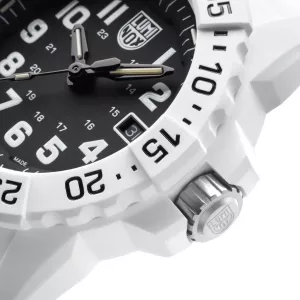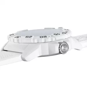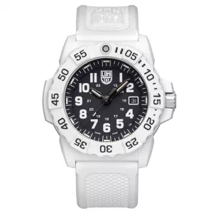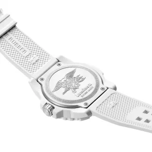 Luminox has collaborated with the U.S. Navy SEALs since its inception, creating rugged and reliable watches that meet the highest tactical standards. This latest addition maintains the 45mm case size of the Series 3500, while introducing a new white fiberglass case and bezel, offering a lightweight yet highly durable construction. The contrast of the black dial with the white hour markers makes it easy to read at a glance. With 200 meters of water resistance, a screw-down 316L stainless steel case back, and scratch-resistant hardened mineral crystal, this watch is built to withstand the most extreme Arctic conditions.