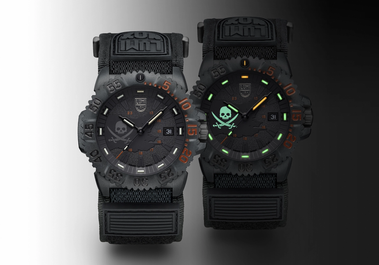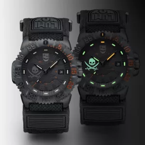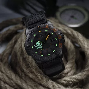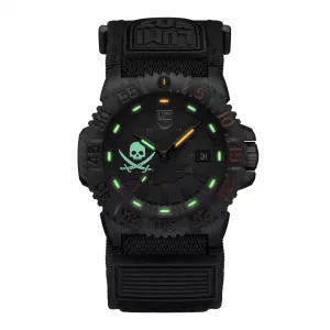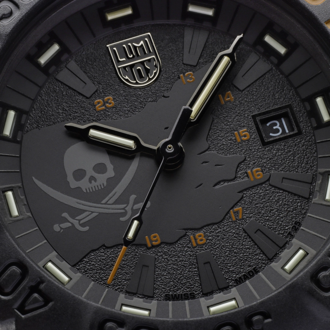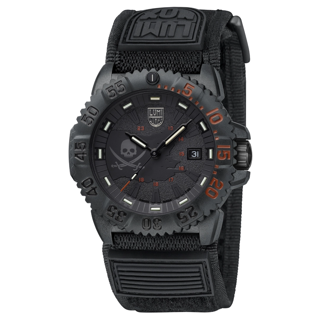 This limited-edition Navy SEAL 3050 watch presents a rebellious twist on an iconic design. Inspired by the legendary Jolly Roger flag symbolising freedom, fearlessness, and ferocity, this unique timepiece is limited to 888 pieces worldwide. The blackout dial of the watch features a luminous skull insignia at 9 o’clock, glowing with Super-LumiNova® in defiant detail. The 44 mm CARBONOX™ case is paired with a CARBONOX™ unidirectional bezel and is water-resistant to 200 meters – engineered for land or sea. Powered by a Swiss quartz Ronda 515 movement and equipped with Luminox Light Technology (LLT), it stays visible for up to 25 years independent of external light sources. The Velcro fast strap, finished with a black rubber Luminox logo, ensures comfort and durability in the most extreme conditions. Rugged, reliable, and rebellious — this watch is a call for adventure.