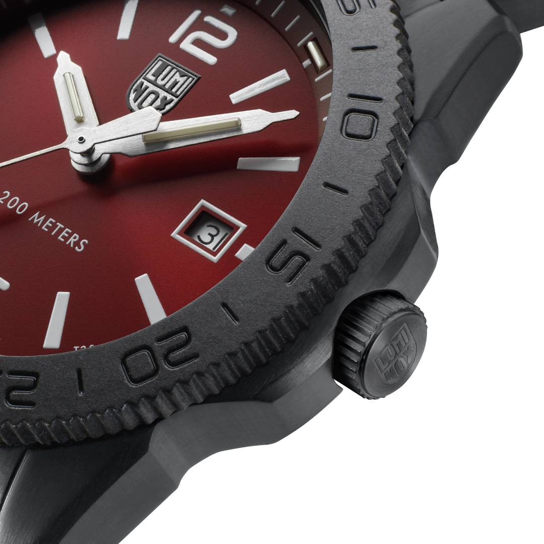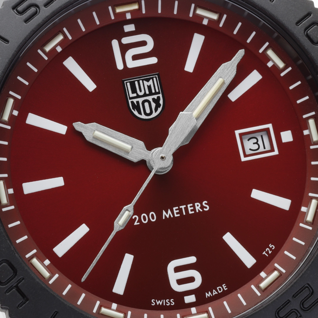 A powerful crimson red sunray dial offers a vibrant, high-contrast display that’s as eye-catching as it is functional. Equipped with Luminox Light Technology for a constant glow in low light and total darkness, this watch is always ready for the next mission. The versatile black cut-to-fit strap can be cut to any desired length and is designed to fit all wrist sizes. With 200 meters of water resistance, a screw-down crown, and a sapphire crystal with anti-reflective coating, the Pacific Diver is a trusted companion below and above water.